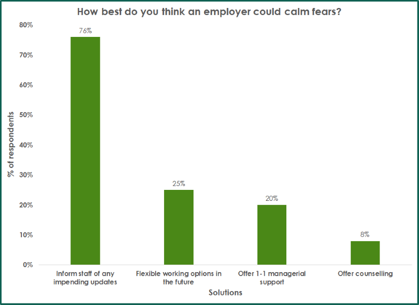 When we asked how best employers should calm Brexit-based distress, 76% said informing employees of any impending updates was the key solution. Flexible working provisions (25%) and one-to-one managerial support (20%) were also thought to be helpful in easing worries. Nearly one in ten respondents even considered counselling to be a suitable offering in way of support.